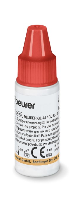 - 2 flacons contenant chacun 4 ml de solution de contrôle pour les lecteurs de glycémie sanguine GL44, GL 50 et GL50 evo de Beurer